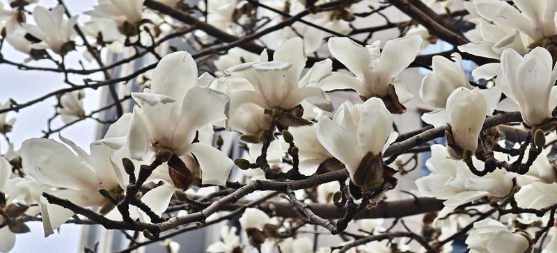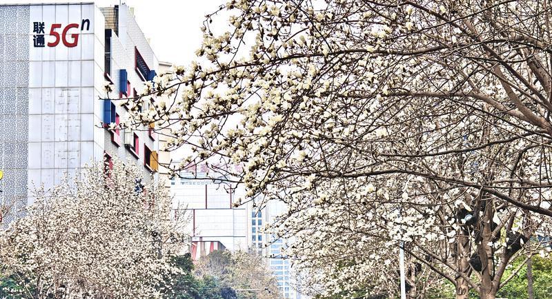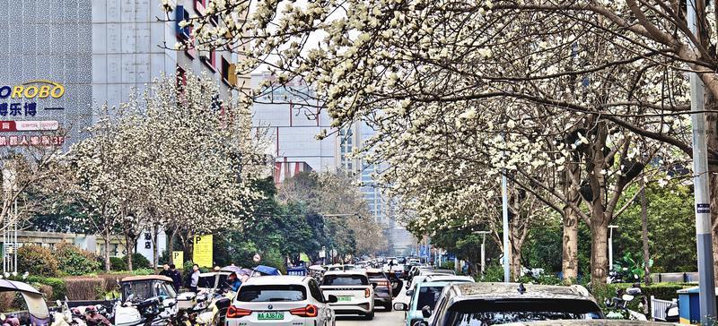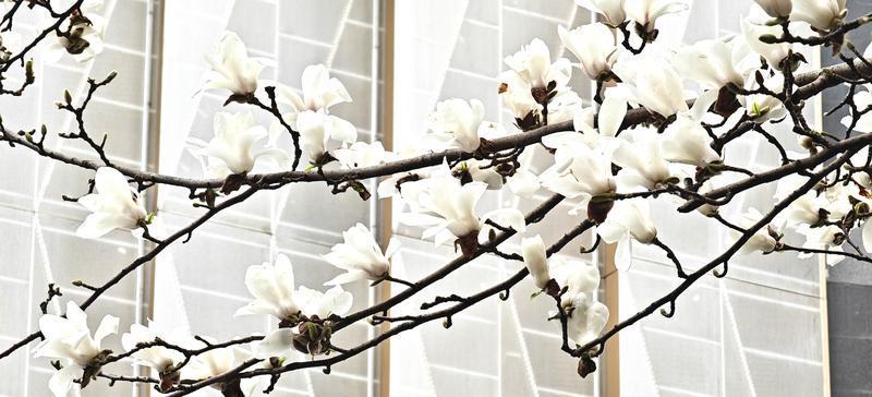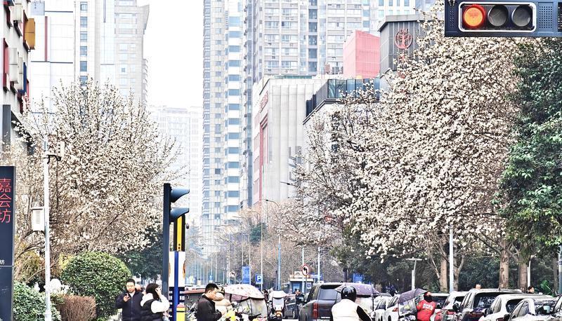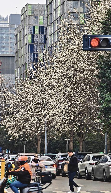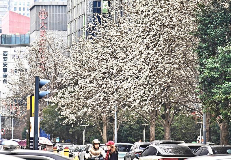 2月25日,西安高新区科技路周边的玉兰树迎来花期,洁白如玉的花朵缀满枝头,与现代化楼宇、川流不息的车流共同绘就一幅春日风景图。