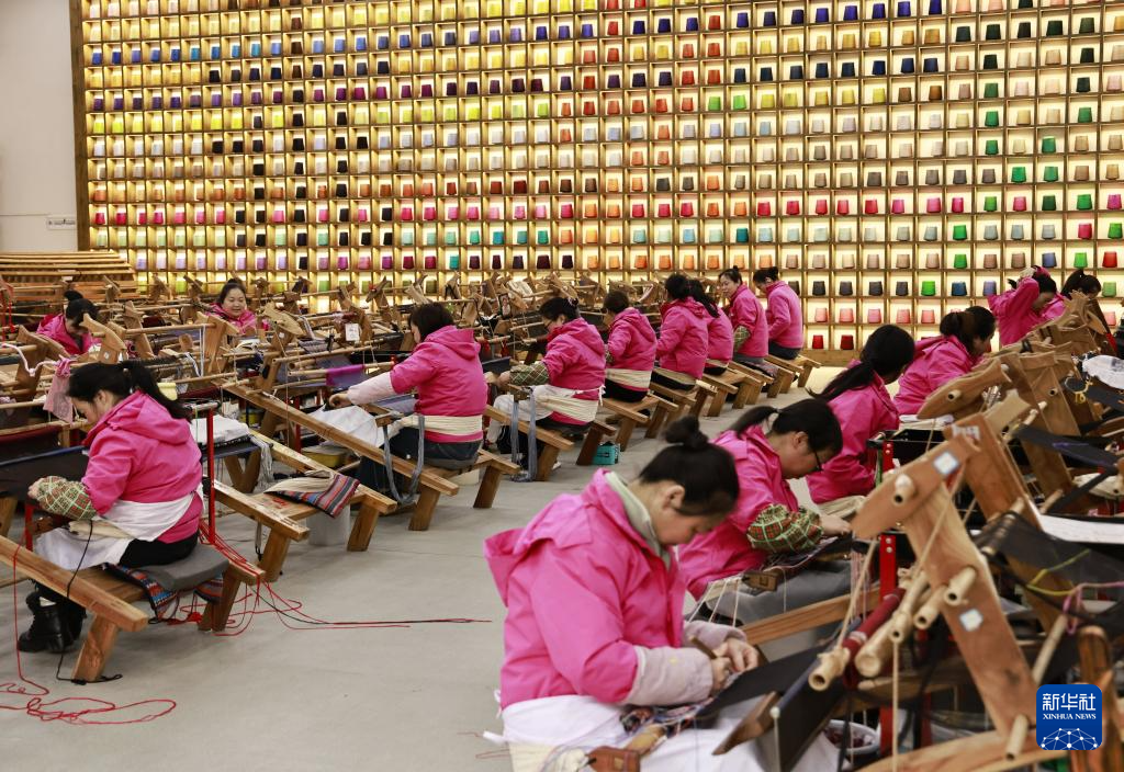 2月24日,在湖南省张家界市武陵源区乖幺妹土家族织锦生产研发基地,工人制作土家族织锦产品。