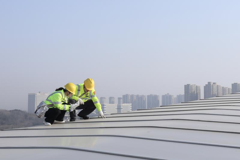 屋面上,张新波化身细心“侦察兵”,指尖抚过每一道钢结构焊缝,细致排查锈蚀、变形隐患;王悌娟紧随其后,俯身检查天窗密封胶条,清掏排水槽积尘,逐颗核对光伏板支架螺丝。