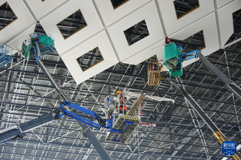 2月26日,工人在西安东站候车大厅内部进行吊顶安装。