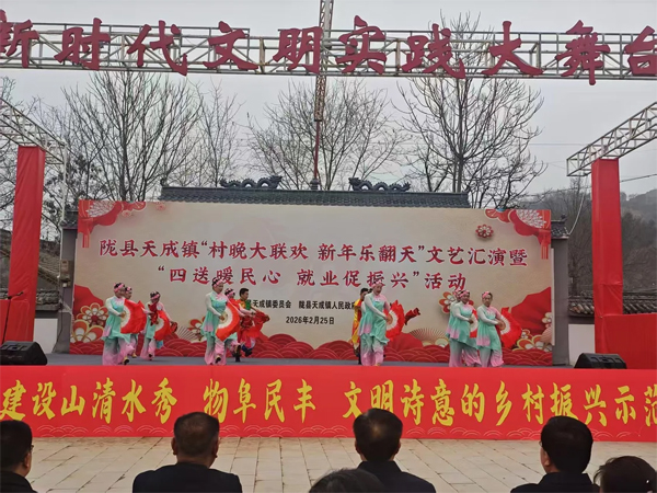 2月25日,陇县新时代文明实践中心走进天成镇“村晚大联欢 新年乐翻天”文艺汇演现场,以一场融合传统韵味与时代气息的文化盛宴,丰富群众精神生活,推动移风易俗,营造出喜庆祥和、文明向上的新春氛围。