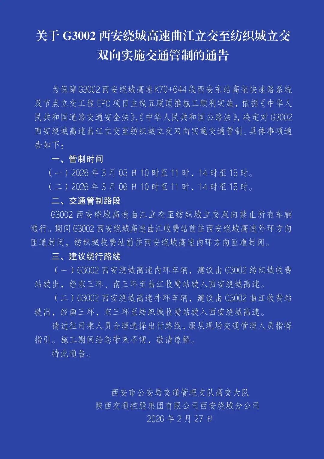 为保障G3002西安绕城高速K70+644段西安东站高架快速路系统及节点立交工程EPC项目主线五联顶推施工顺利实施,依据《中华人民共和国道路交通安全法》《中华人民共和国公路法》,决定对G3002西安绕城高速曲江立交至纺织城立交双向实施交通管制。具体事项通告如下: