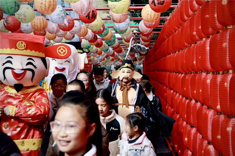 在钟宝镇,盐道文化广场长廊下,千盏红灯笼随风摇曳,映红了人们的笑脸。巡游队伍里,“福禄寿喜财”五个人扮成神仙,穿梭在人群中给孩子发红包、糖果。孙悟空和猪八戒和孩子们欢乐互动。唢呐声穿过老街,有人跟着节奏扭起了秧歌,队伍越走越长,跟在后面的人越来越多。