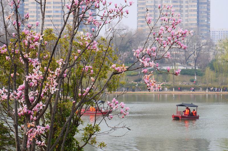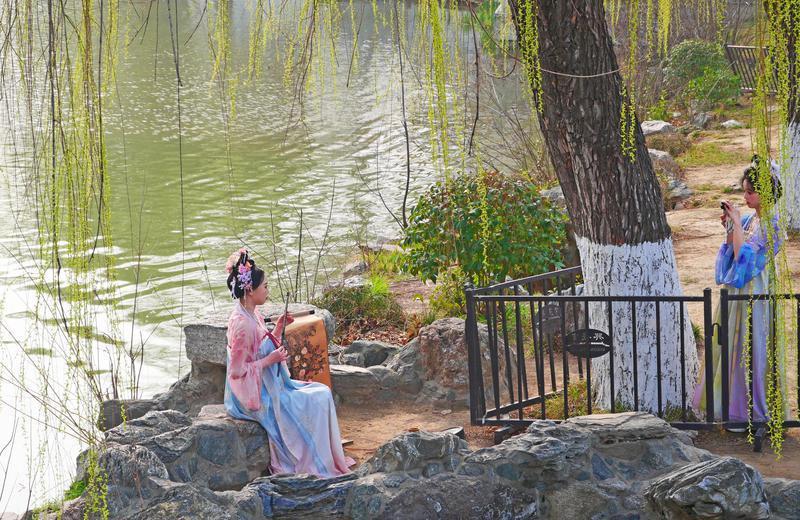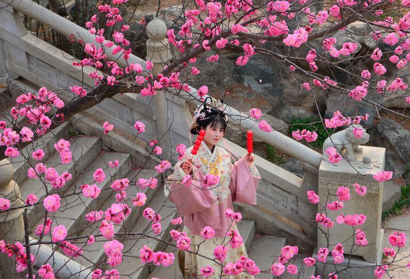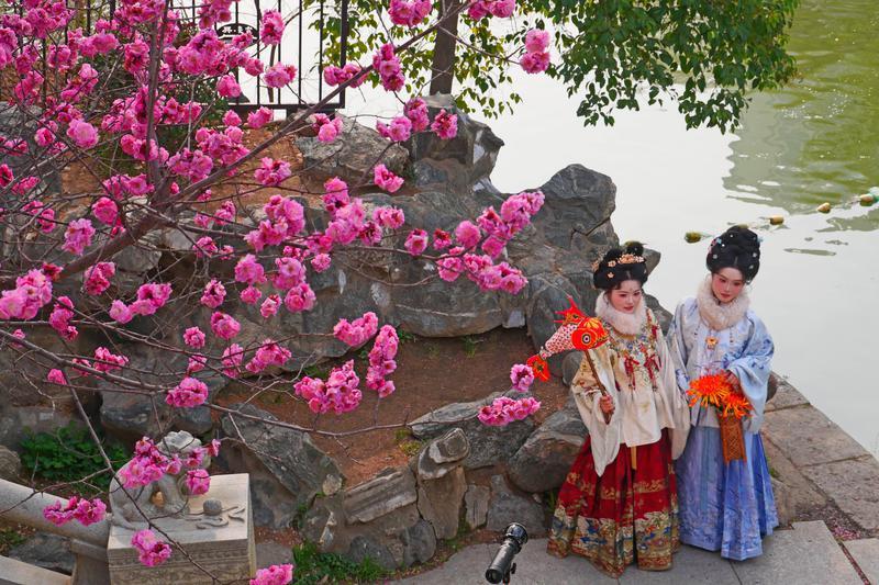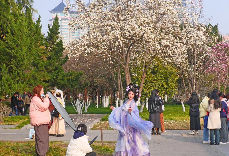3月4日,兴庆宫公园内红梅、杏花、玉兰次第绽放,垂柳吐绿,春意盎然。吸引不少身着汉服的市民游客游园赏花,衣袂翩跹与春色相融,现代建筑与唐风景致交相辉映,尽显古城春日诗意画卷。