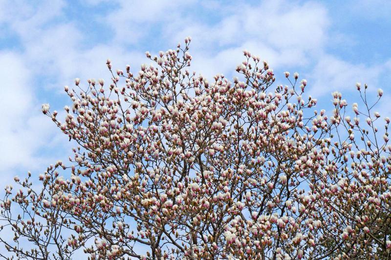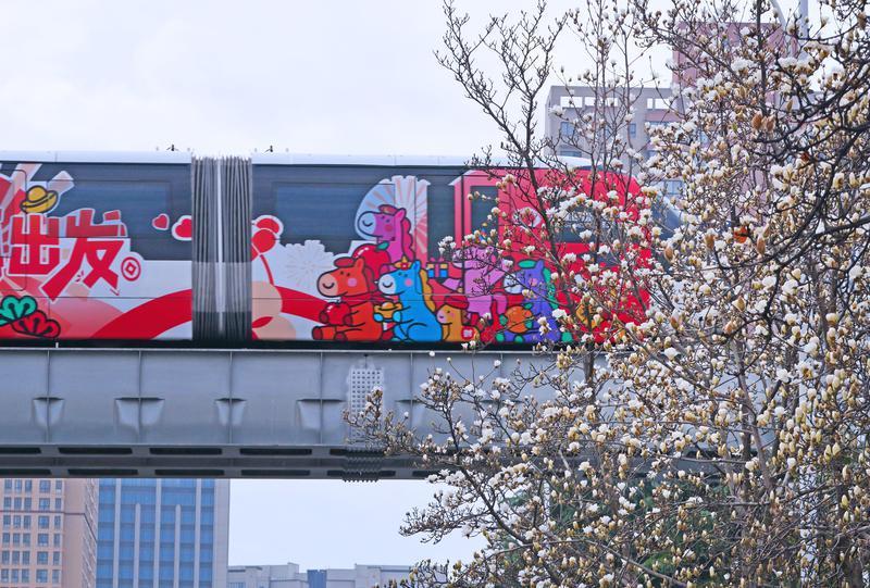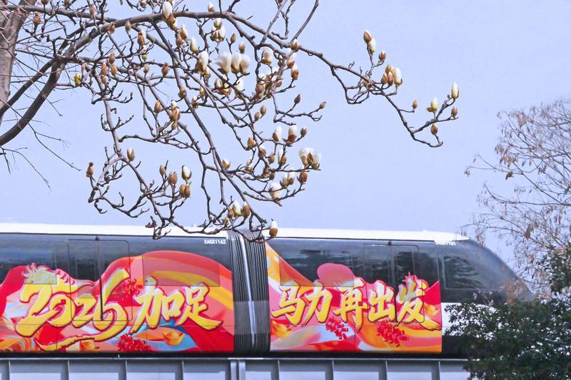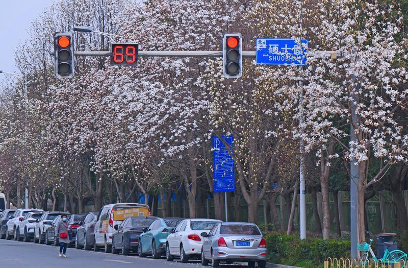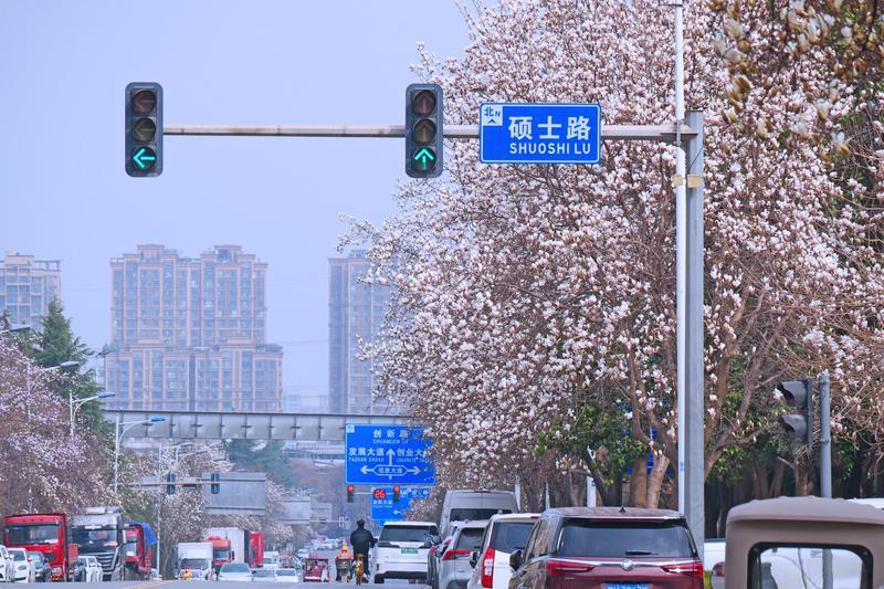 3月6日,西安硕士路两旁的玉兰花迎来盛花期。洁白的花瓣带着粉紫晕染,在枝头层层叠叠,如云似雪,将整条街道装点成浪漫的花廊。车流穿梭间,玉兰与现代建筑、轨道交通相映成趣。“2026 加足马力再出发”的彩绘云巴列车与繁花交织,勾勒出城市的生机与活力。