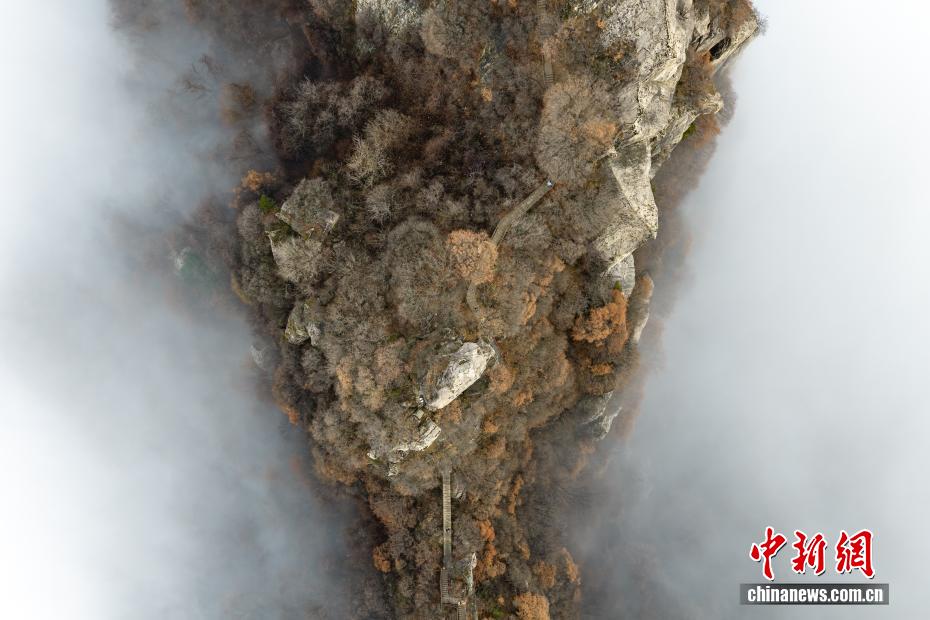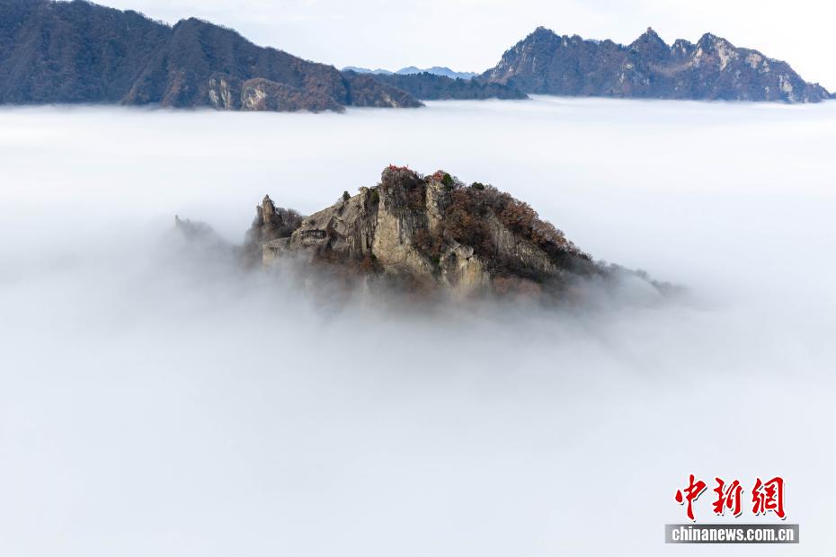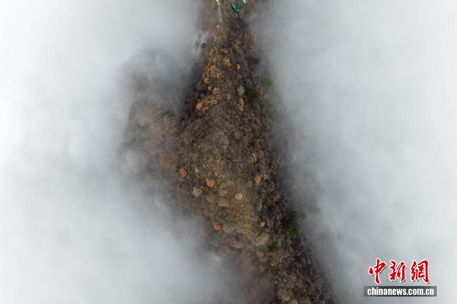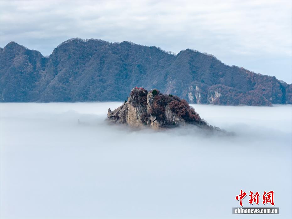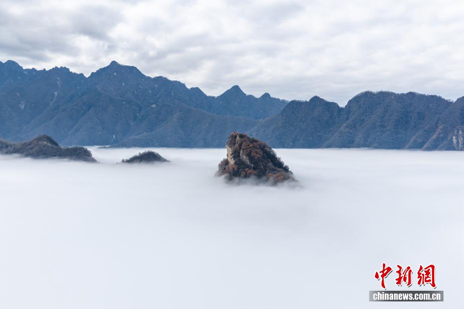 3月8日,陕西西安。秦岭翠华山巅云海翻涌,峰峦隐现于云雾之间,宛如一幅灵动飘逸的水墨山水画卷。图为秦岭翠华山云海。(无人机照片)