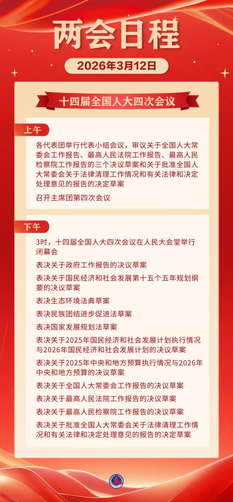 12日下午3时,十四届全国人大四次会议在人民大会堂举行闭幕会,表决关于政府工作报告的决议草案,表决关于国民经济和社会发展第十五个五年规划纲要的决议草案,表决生态环境法典草案,表决民族团结进步促进法草案,表决国家发展规划法草案,表决关于2025年国民经济和社会发展计划执行情况与2026年国民经济和社会发展计划的决议草案,表决关于2025年中央和地方预算执行情况与2026年中央和地方预算的决议草案,表决关于全国人大常委会工作报告的决议草案,表决关于最高人民法院工作报告的决议草案,表决关于最高人民检察院工作报告的决议草案,表决关于批准全国人大常委会关于法律清理工作情况和有关法律和决定处理意见的报告的决定草案。