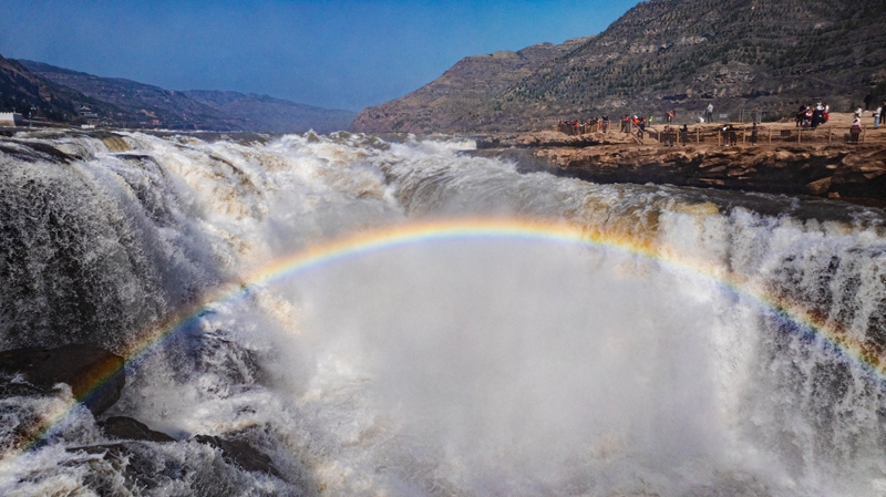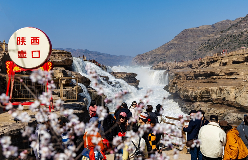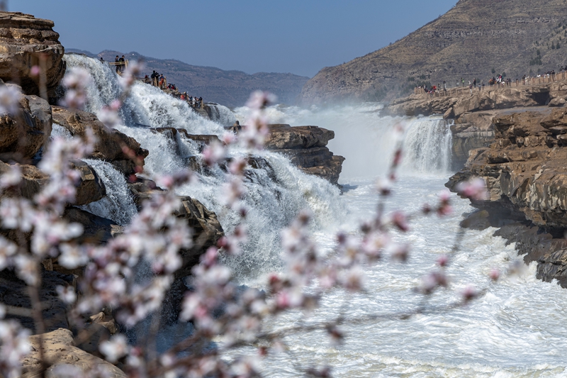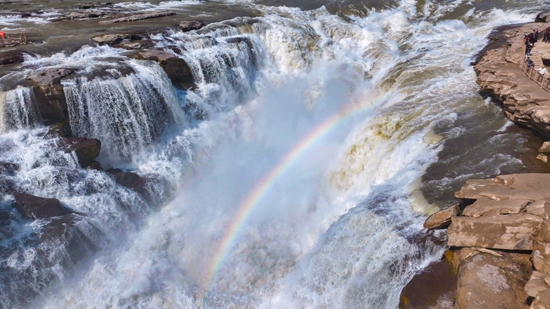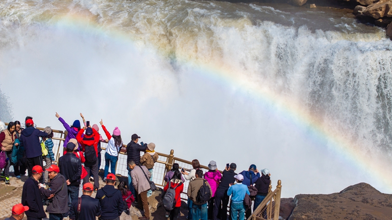 眼下,陕西黄河壶口瀑布水量持续激增,峰值流量可达每秒700立方米。黄河水裹挟着融冰奔涌向前,水雾漫天升腾,阳光穿雾而过,架起一道绚丽彩虹,横跨奔腾瀑面,与奔涌不息的激流、岸边初绽的山桃花相映成趣,共同绘就一幅春日黄河画卷,吸引大批游客与摄影爱好者慕名前来观赏打卡,定格美景。(宋洋波)