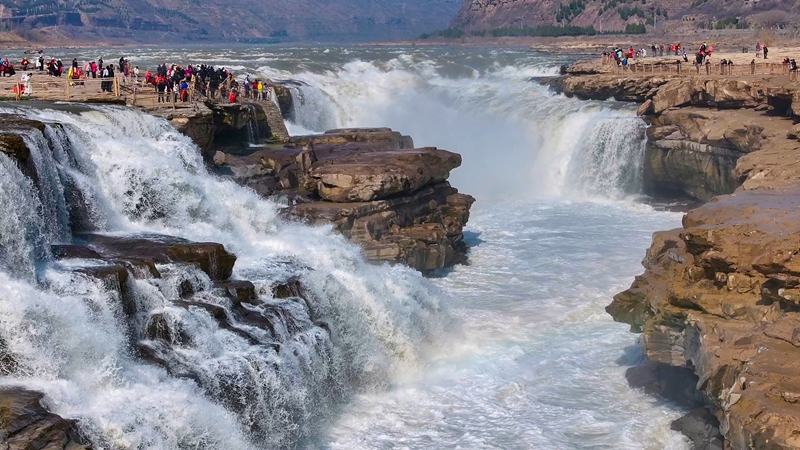 近日,随着气温回暖,黄河上游冰层逐步消融,陕西黄河壶口瀑布迎来“桃花汛”景观。