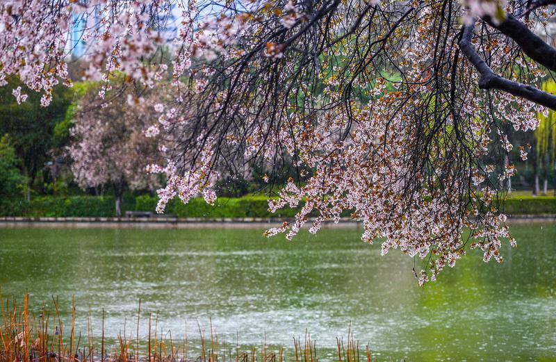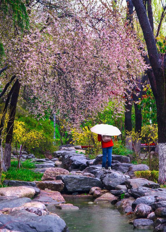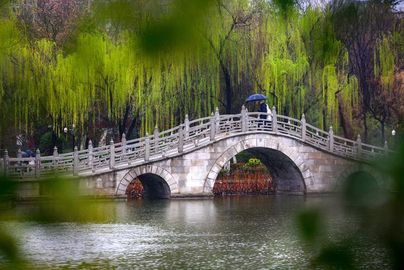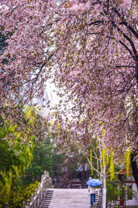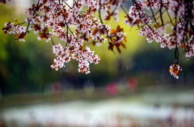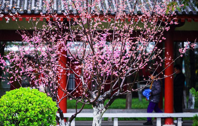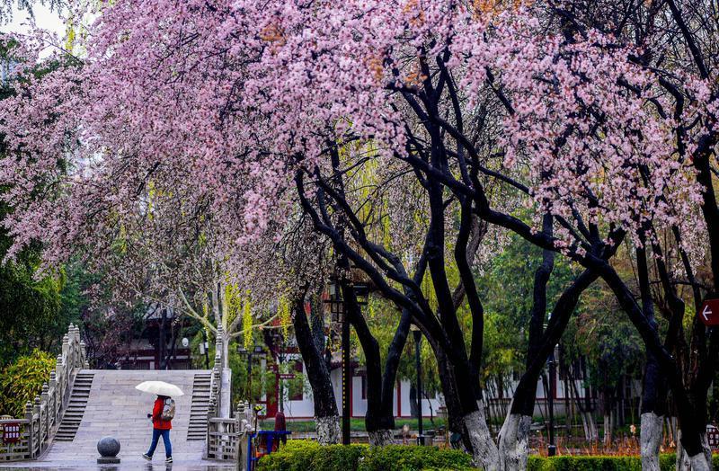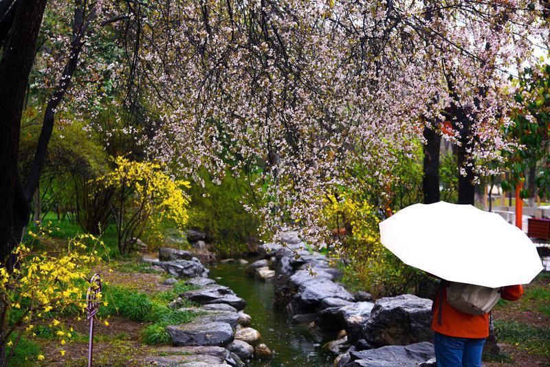 3月14日,淅淅沥沥的春雨漫染西安,为城市披上朦胧轻纱。雨雾中,草木焕新、繁花缀露,市民漫步在丰庆公园里,定格春日限定美景,感受古都长安独有的春日韵味。