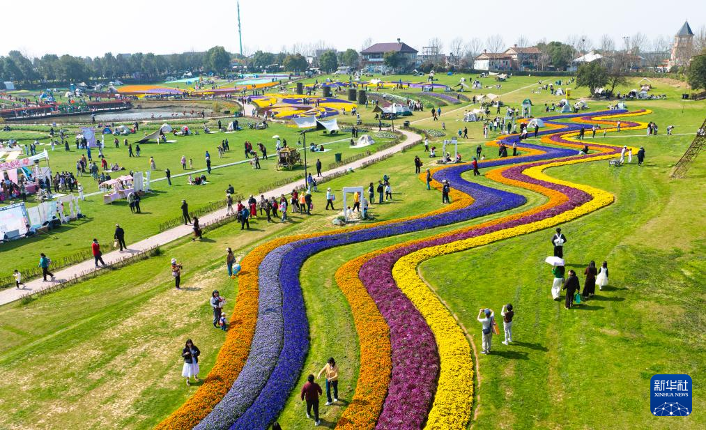 3月14日,游人在武汉花博汇赏花游览(无人机照片)。