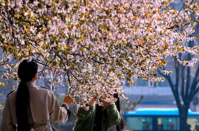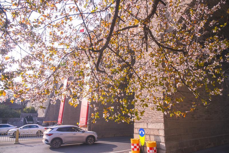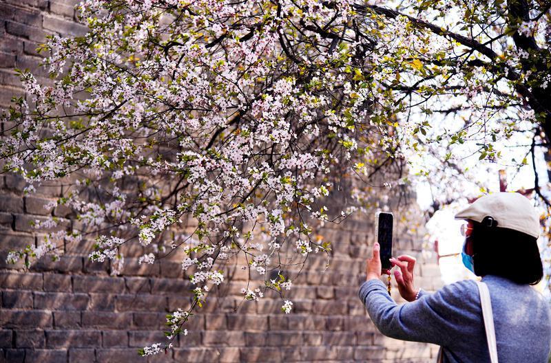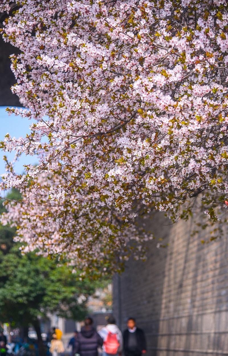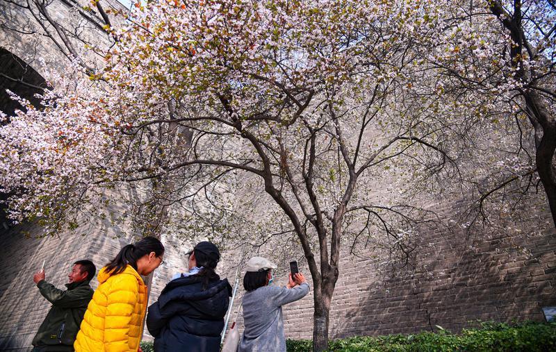 3月15日,春风送暖,西安城墙下紫叶李竞相绽放,粉白的花朵缀满枝头,与古朴厚重的城墙相映成趣,勾勒出一幅“花映古城”的春日盛景,吸引众多市民游客前来踏青赏花、打卡留念。