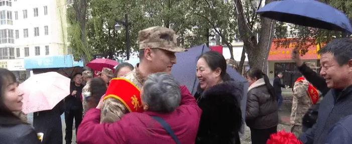 当天虽然下着雨,但现场庄重与热烈氛围丝毫未减。即将奔赴军营的新兵们身着崭新戎装,身姿挺拔、精神抖擞,胸前佩戴的大红花与肩上的绶带相映生辉,眼神中满是对军旅生涯的憧憬与向往,更有守护家国的坚定与担当。
