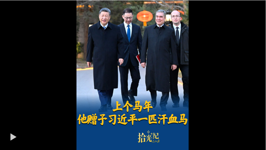 3月18日,国家主席习近平会见土库曼斯坦民族领袖、人民委员会主席别尔德穆哈梅多夫。2014年,别尔德穆哈梅多夫曾赠予中方一匹汗血马。“推动中土关系像汗血宝马一样马不停蹄、一马当先”,一起回顾中土的“骏马外交”。
