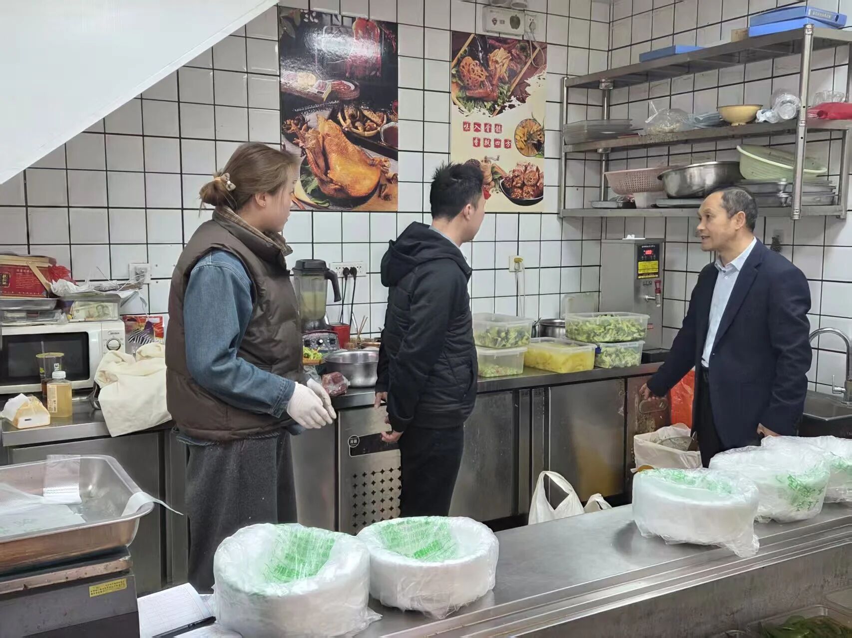 与此同时,市场监管工作人员主动走进门店,面对面讲解规范要求:“证照要在显眼位置公示,后厨环境要保持整洁,‘光盘行动’也要主动引导顾客参与。”遇到商户疑问,便结合案例耐心解释:“把这些问题都整改到位,既符合规范要求,也能让顾客更放心。”一旁的经营户点头回应:“讲得很清楚,我们按要求整改,把环境搞好,顾客也更愿意来。”在一问一答之间,创文标准逐步转化为商户自觉遵守的日常行为。