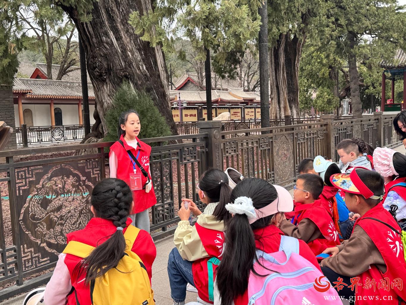 3月29日,在黄帝陵景区,来自黄陵县新区第二小学的“红领巾讲解员”正在为研学团讲解千年古柏的故事。