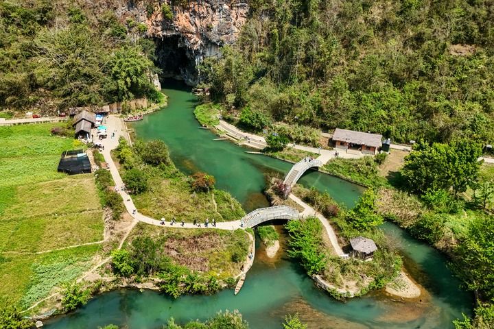 2026年3月17日,游客在云南省文山壮族苗族自治州广南县坝美景区游览(无人机照片)。近年来,当地深入挖掘坝美村农文旅融合发展潜力,一方面打造沉浸式旅游体验项目,让游客在欣赏自然风光的同时,感受壮乡传统农耕文化;另一方面景区积极吸纳本地村民就业,鼓励其因地制宜创业增收,推动农业与旅游业互促共进。新华社记者 彭奕凯 摄