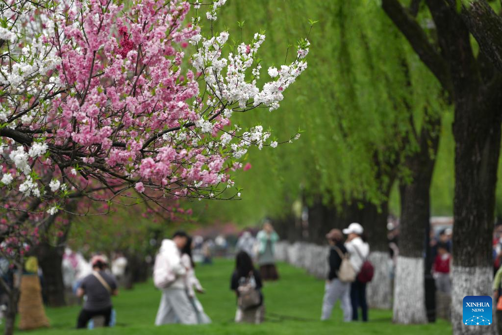 Tourists visit the West Lake scenic area in Hangzhou, east China's Zhejiang Province, April 2, 2026. Recently, West Lake in Hangzhou has been adorned with blooming peach trees and verdant willows, showing bright spring colors that attract crowds of visitors. (Xinhua/Huang Zongzhi)