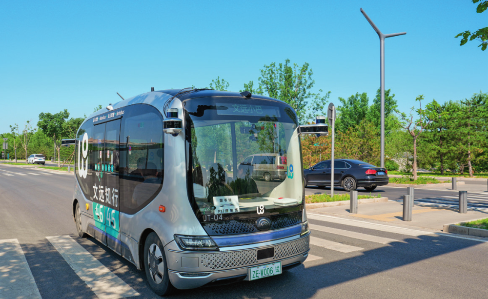 在北京城市副中心,一辆无人驾驶小巴在接送乘客(2024年5月21日摄) 鞠焕宗摄/本刊