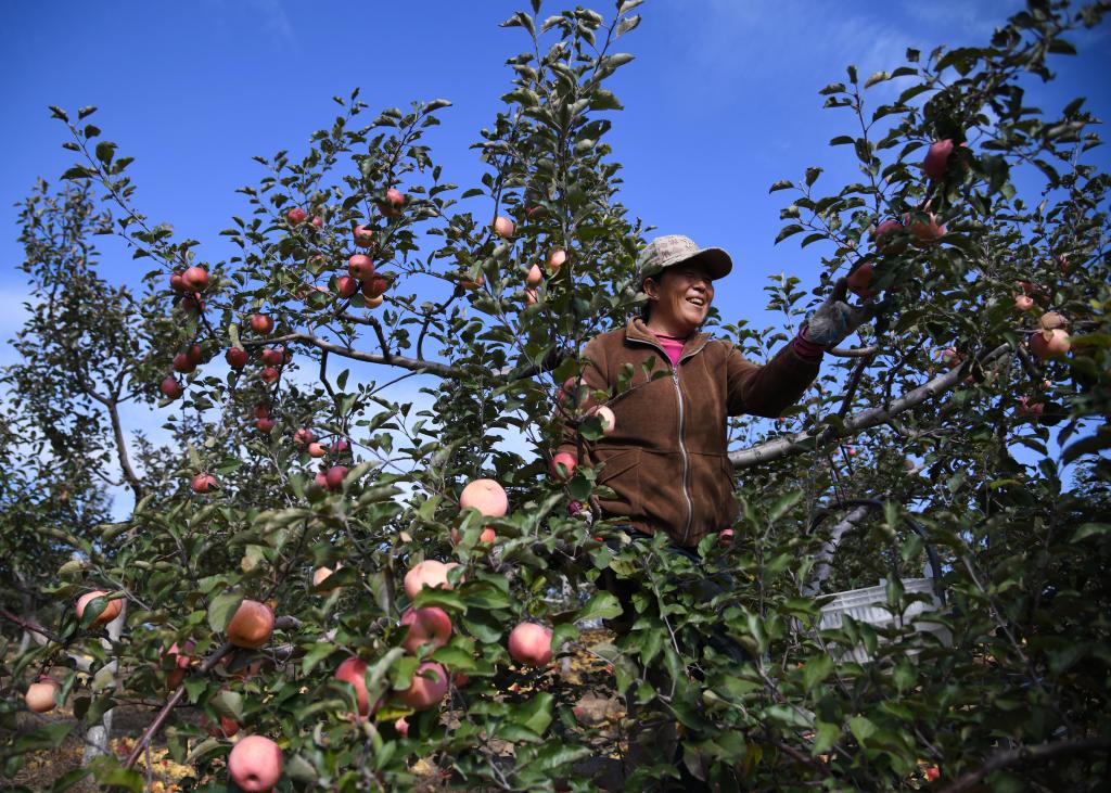 果农在陕西省榆林市横山区赵石畔村一处果园采收苹果(2025年11月4日摄)。 新华社记者 张博文 摄