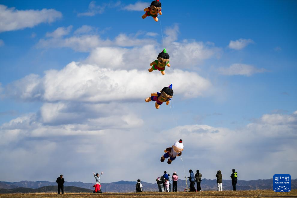 4月5日,人们在内蒙古呼和浩特敕勒川草原观看大型风筝放飞。