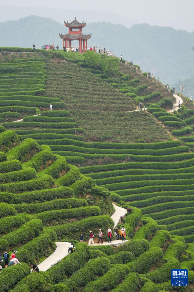 4月5日,人们在四川省雅安市牛碾坪万亩观光茶园游览。