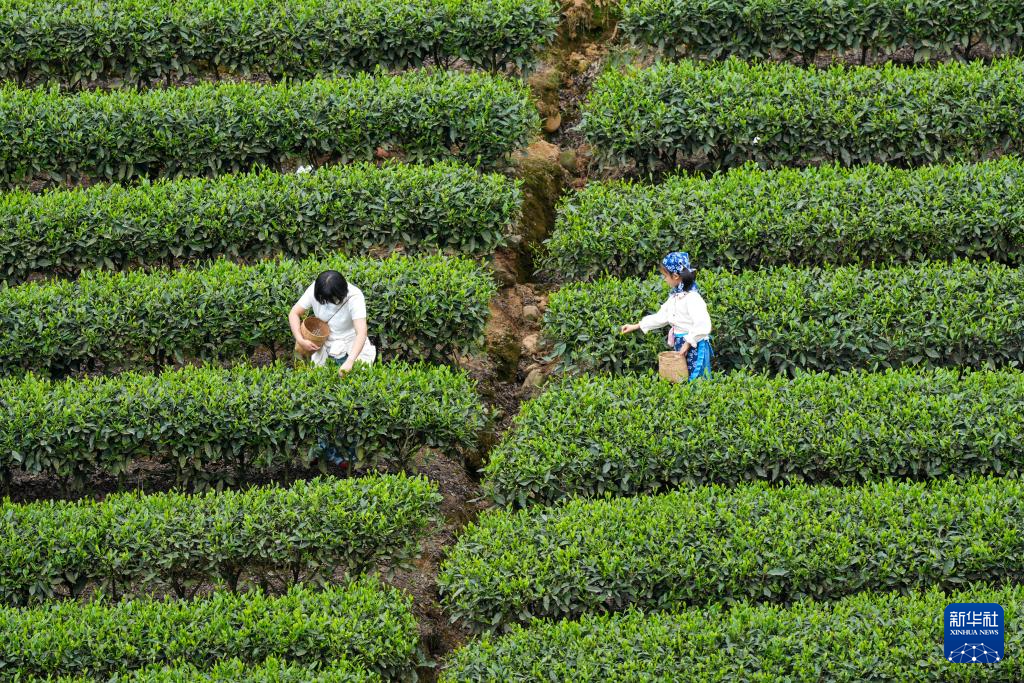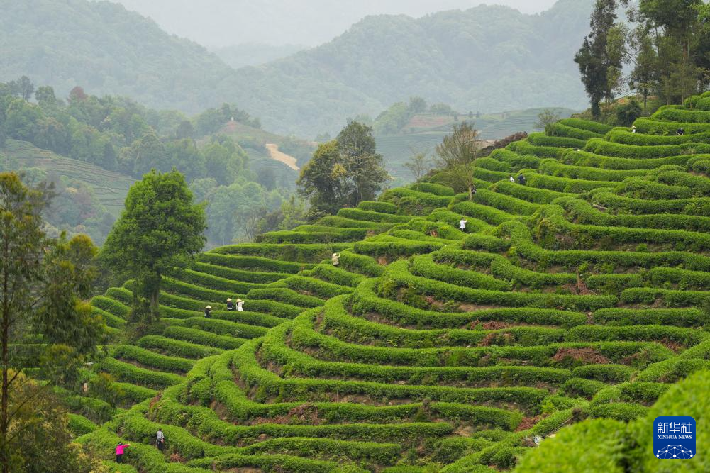 4月5日,人们在四川省雅安市牛碾坪万亩观光茶园体验采茶。