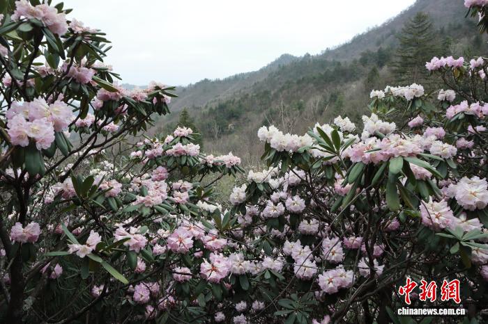 4月5日,陕西商洛,位于秦岭腹地的木王山景区内,高山杜鹃盛放。起伏的山峦被姹紫嫣红的花海覆盖。该地杜鹃花花带分布面积达2万余亩,拥有秦岭高山杜鹃、秀雅杜鹃、满山红杜鹃等20余个品种。清明时节,吸引了不少游客前来赏花踏青。图为秦岭高山杜鹃与远处山峦交相辉映。中新社记者 李一璠 摄