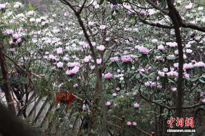 4月5日,陕西商洛,位于秦岭腹地的木王山景区内,高山杜鹃盛放。起伏的山峦被姹紫嫣红的花海覆盖。该地杜鹃花花带分布面积达2万余亩,拥有秦岭高山杜鹃、秀雅杜鹃、满山红杜鹃等20余个品种。清明时节,吸引了不少游客前来赏花踏青。图为游人漫步山间,观赏秦岭高山杜鹃。中新社记者 李一璠 摄