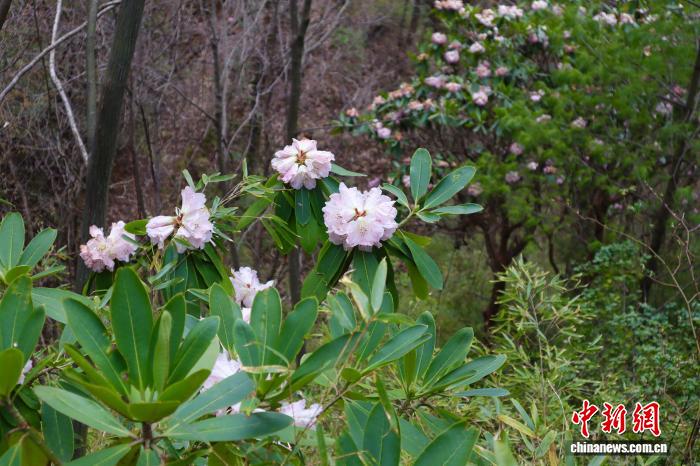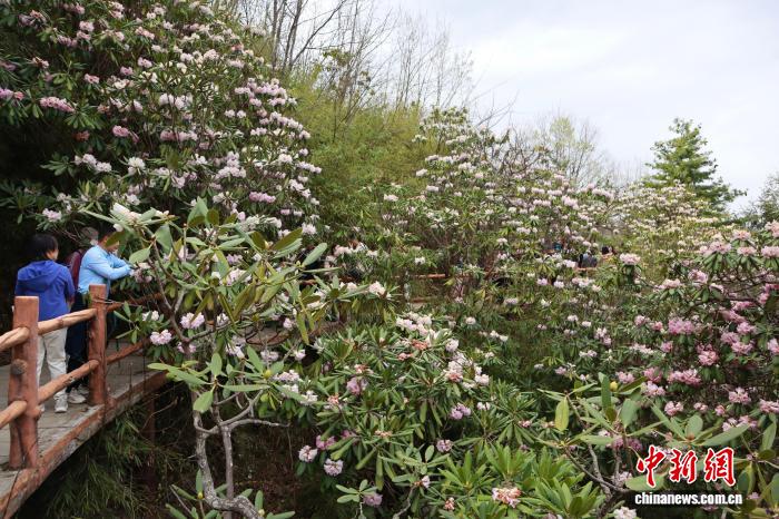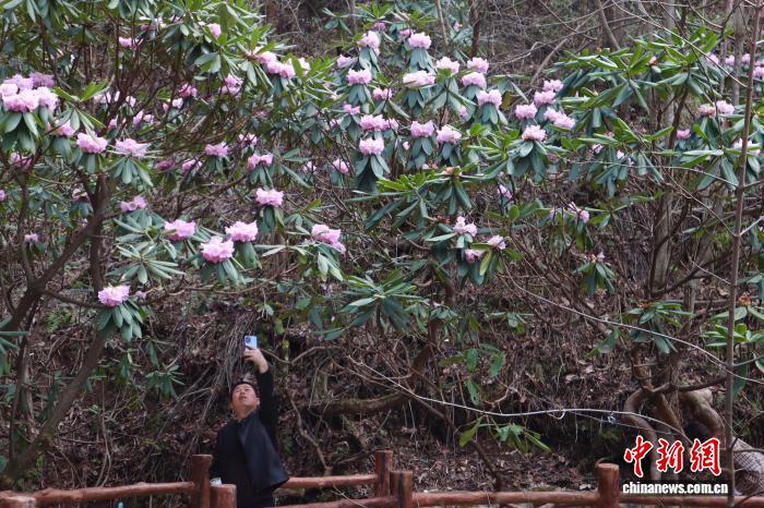 4月5日,陕西商洛,位于秦岭腹地的木王山景区内,高山杜鹃盛放。起伏的山峦被姹紫嫣红的花海覆盖。该地杜鹃花花带分布面积达2万余亩,拥有秦岭高山杜鹃、秀雅杜鹃、满山红杜鹃等20余个品种。清明时节,吸引了不少游客前来赏花踏青。图为游人观赏秦岭高山杜鹃并拍照留念。中新社记者 李一璠 摄