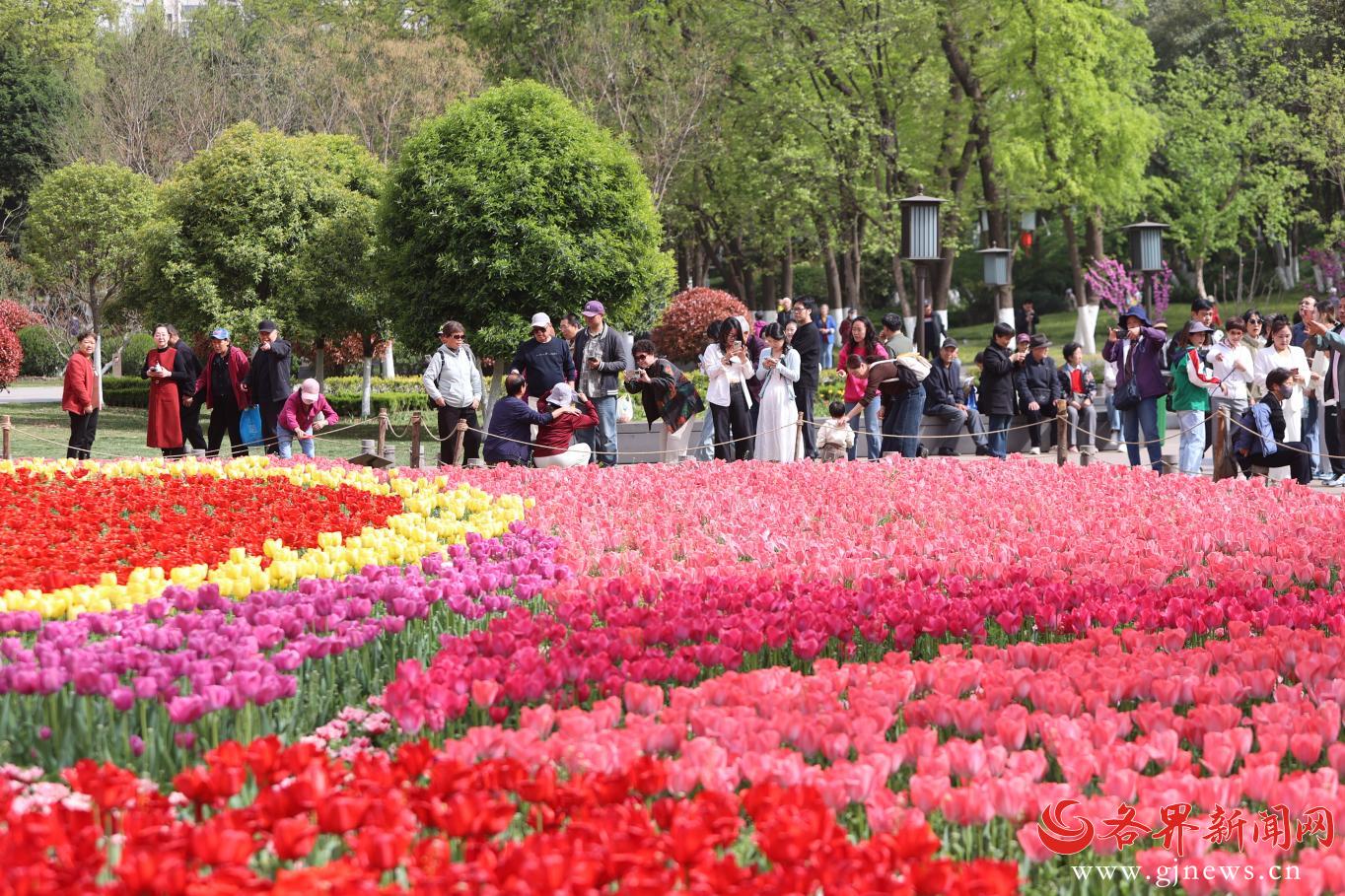 近日,西安兴庆宫公园郁金香进入盛花期,红、黄、粉、紫等各色花朵交织成一片绚丽花海,吸引众多市民游客赏花、留影。花间小径人流如织,大家纷纷举起手机、相机寻找最佳角度,一张张笑脸与郁金香同框,定格下春日最动人的图景。