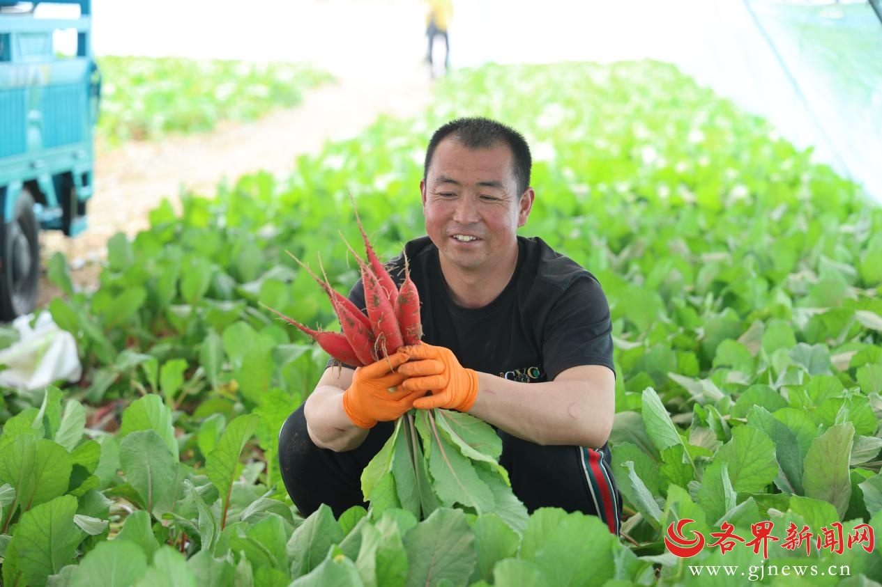 4月10日,在定边县定边街道办十里沙村的蔬菜大棚内,种植户胡飞虎展示刚采收的水萝卜,脸上洋溢着丰收的喜悦。马晓妮 摄
