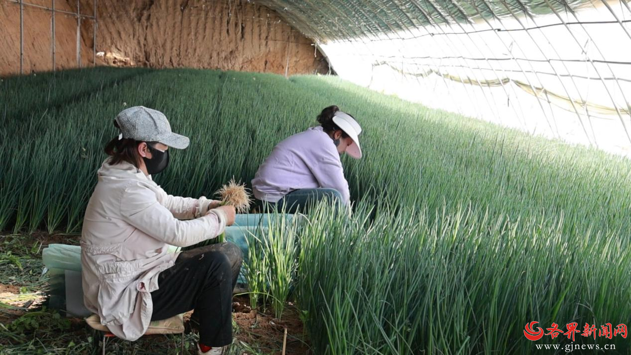 4月10日,在定边县白泥井镇公布井村的大棚内,务工人员正忙着采收小葱。马晓妮 摄