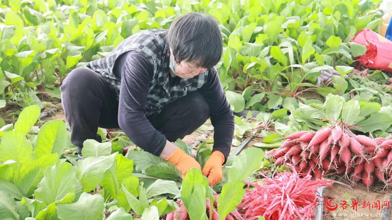 4月10日,在定边县定边街道办十里沙村的蔬菜大棚内,务工人员正忙着采收水萝卜。马晓妮 摄