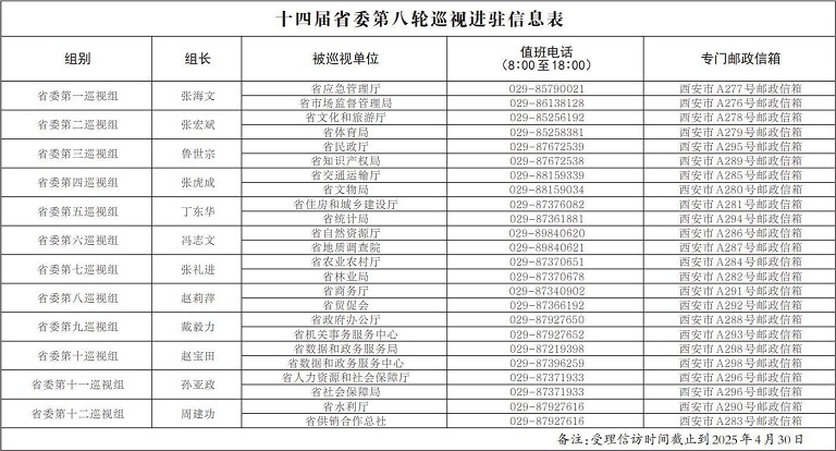 据悉,12个省委巡视组将在被巡视单位工作50天左右,其间设立专门值班电话和邮政信箱,主要受理反映被巡视单位党组织领导班子及其成员、下一级党组织主要负责人和重点岗位人员问题的来信来电来访,重点是关于违反政治纪律、组织纪律、廉洁纪律、群众纪律、工作纪律和生活纪律等方面的举报和反映。巡视组受理信访时间截止到2025年4月30日。