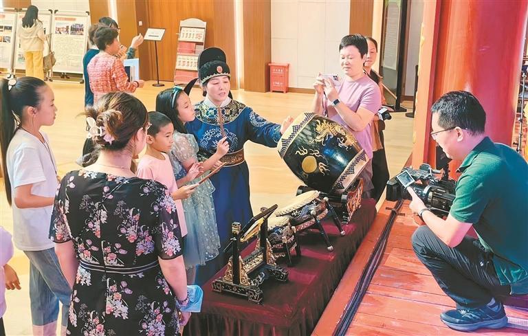 中国非物质文化遗产馆内的互动体验区,孩子们在西安鼓乐传承人的指导下尝试敲击座鼓。 (受访单位供图 资料图片)