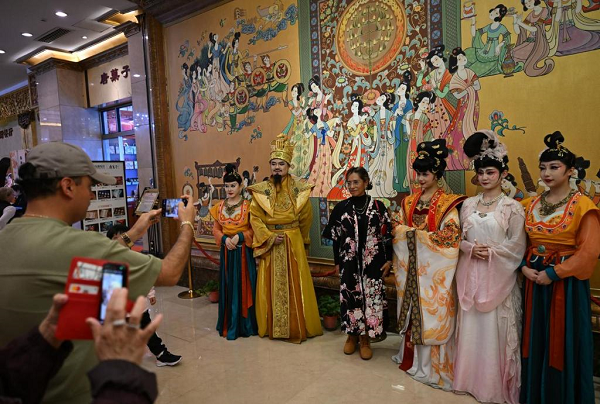 10月4日,在西安唐乐宫,墨西哥游客在观看完演出后与演员合影。新华社记者 李一博 摄