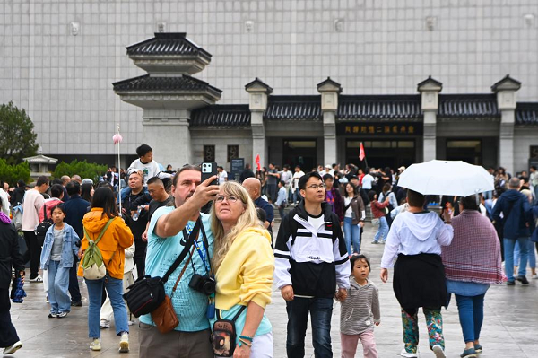 10月1日,外国游客在秦始皇帝陵博物院参观。新华社发(张天柱摄)