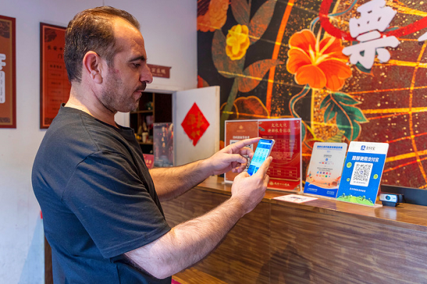 外国游客在西安景区体验支付宝扫码支付服务。新华社记者 李一博 摄