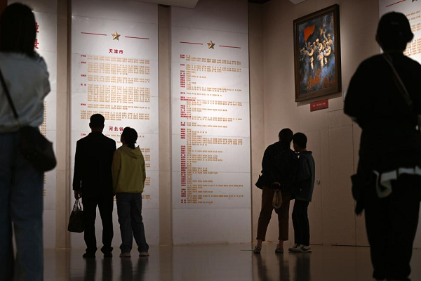10月8日,游客在天津平津战役纪念馆瞻仰烈士名录墙。新华社记者赵子硕摄