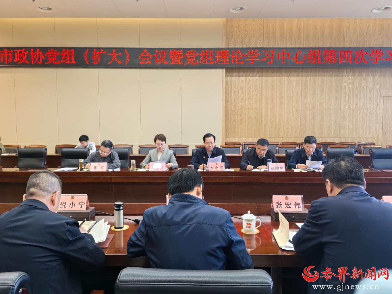 各界新闻网讯(记者 白小芳 贺鹏飞) 4月15日,延安市政协召开党组(扩大)会议暨党组理论学习中心组学习会议,传达学习中共中央政治局会议精神、习近平总书记近期重要讲话重要指示精神,集体学习《习近平关于树立和践行正确政绩观论述摘编》相关内容、中央和市委有关文件精神,传达学习市委有关会议精神,听取学习教育进展情况汇报。市政协党组副书记、副主席刘小鹏主持会议并讲话。