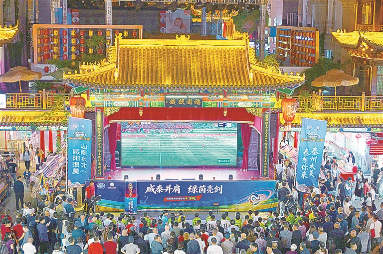 4月18日,“咸泰并肩·绿茵亮剑”——咸阳泰州双城联动看“苏超”嘉年华系列活动首场,在福园巷子中心广场举行。李赟 摄