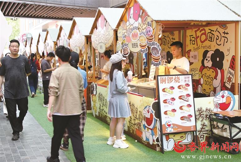 4月17日,西安南飞鸿乐荟中心的“酵醒面包节”与中贸广场的“FAFA面包节”同步开启,120余家面包品牌集中亮相。现场除各式面包外,还有泰式小吃、意式冰淇淋、宠物零食、文创周边等品类。现场设置的打卡兑换活动,也吸引了不少市民游客参与。