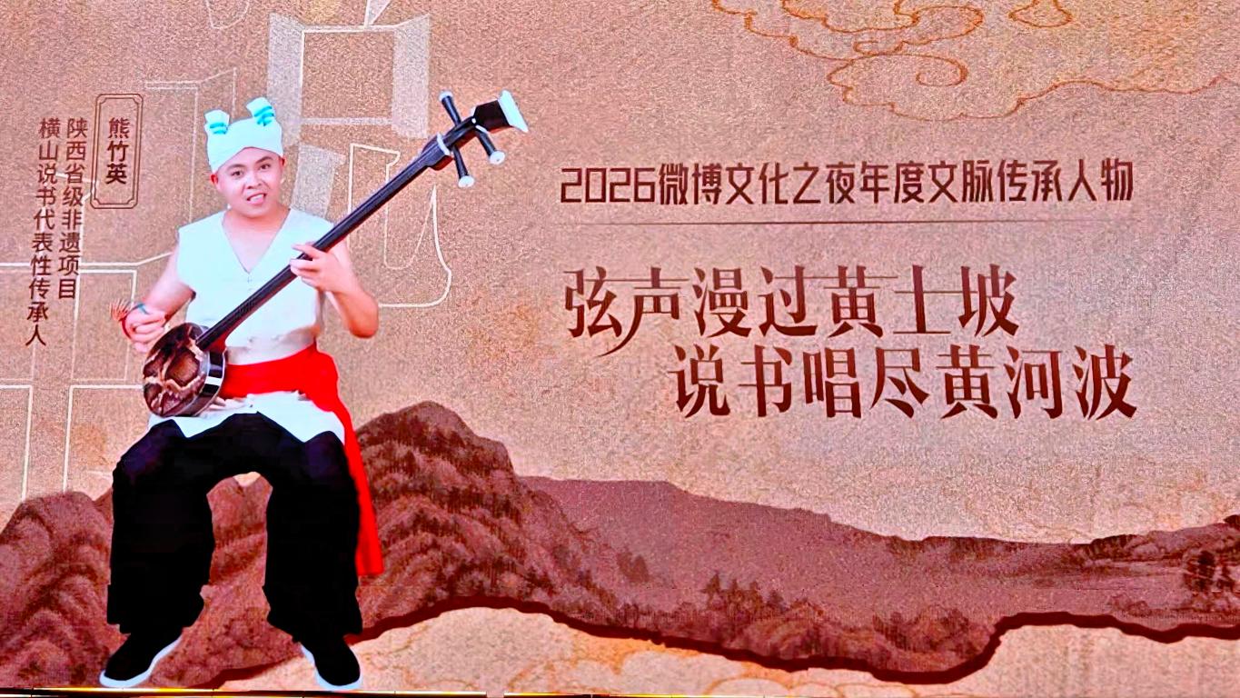各界新闻网讯(记者 许鹏 通讯员 陈宇)近日,“2026 微博文化之夜”在河南艺术中心大剧院圆满落幕。榆林市横山区陕北说书代表性传承人、陕西省曲艺家协会副主席熊竹英受邀出席活动,同时与全国其他8位非遗代表性传承人共同获评“年度文脉传承人物”。