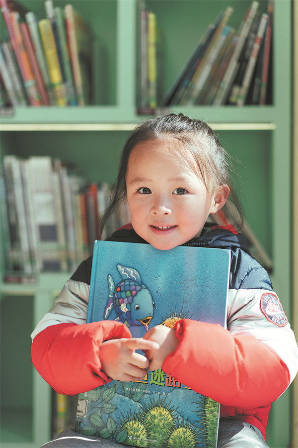 A girl holds a picture book in a library. LI CHENGCHEN/FOR CHINA DAILY
