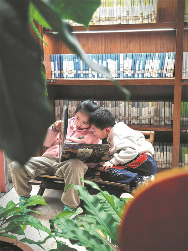 An older sister reads a picture book to her brother in a library in Jiangxi province.