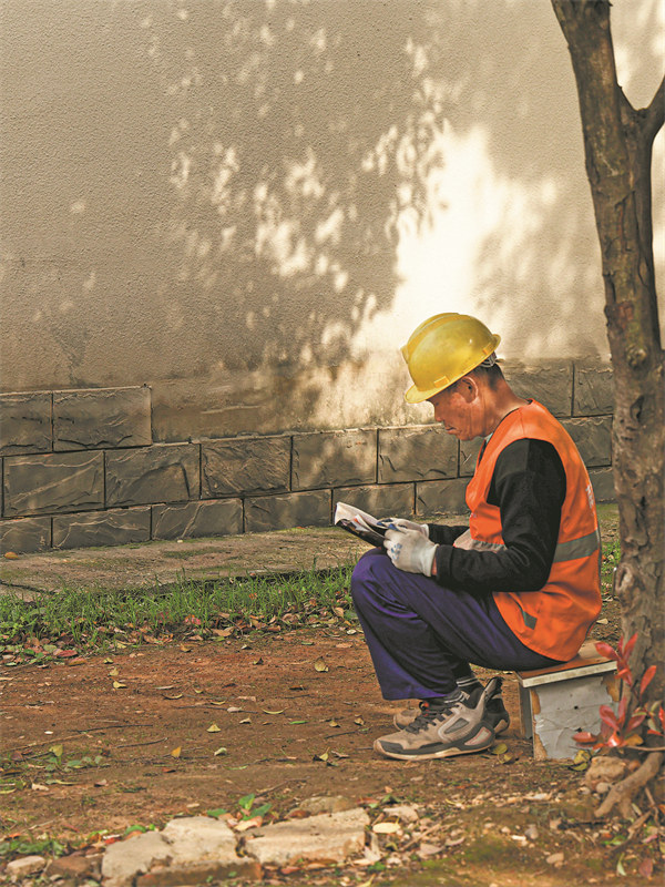 A construction worker reads during a break at a worksite. ZHOU HAO/FOR CHINA DAILY