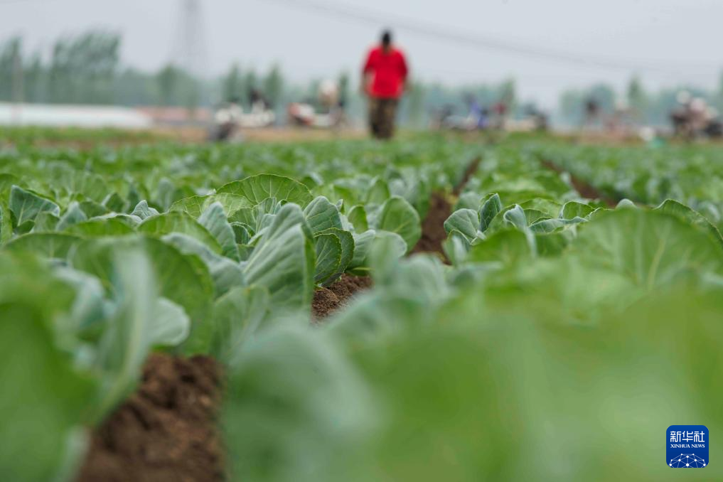 4月26日,河北省唐山市玉田县虹桥镇农民在菜田管护幼苗。