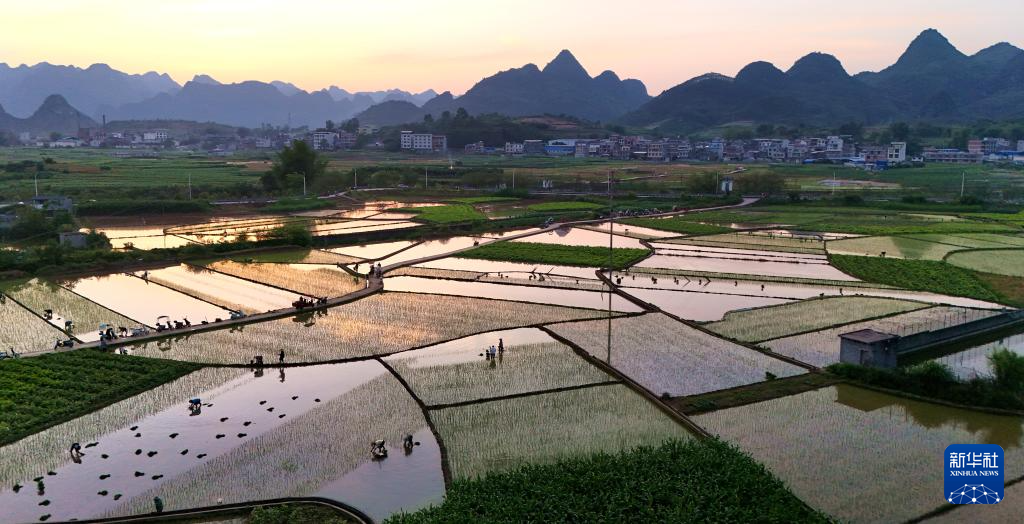 4月25日,农民在广西来宾市忻城县城关镇都乐村田间进行早稻插秧(无人机照片)。