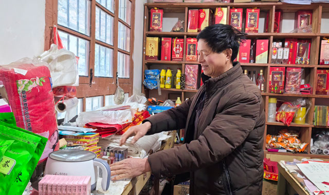 1月31日,在商洛市山阳县中村镇梅岔村,今年56岁的夏军正忙着整理货架上的物品,不时有村民来小卖部购买商品。